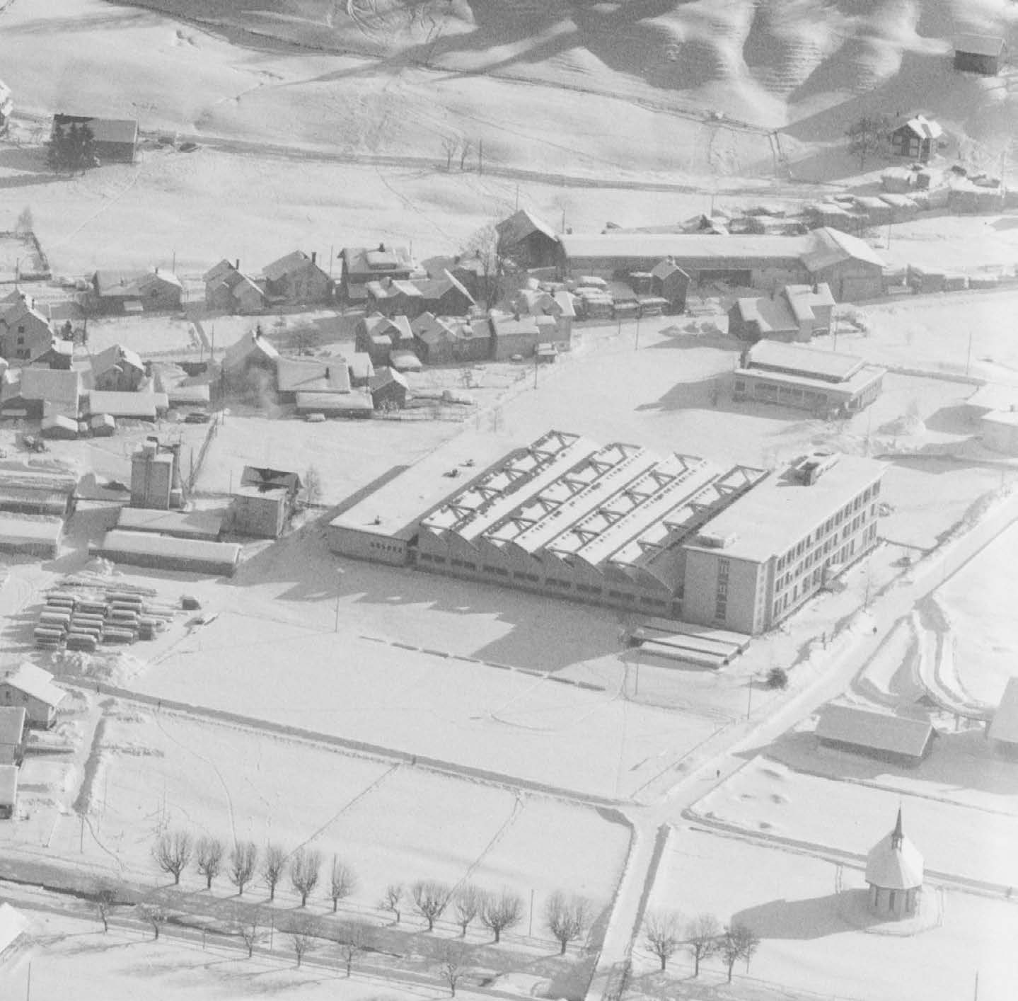 Heute befindet sich der Fussball-Trainingsplatz, das dreigeschossige Bürogebäude (B) mit angegliederter Shedhalle (E;B), mehrere Werkhallen mit Flachdächern (E), ein Zweifamilienhaus und ein Garagengebäude (C), sowie das alte Kantinengebäude (G), welches als Gewerberaum umgebaut wurde, auf dem Grundstück.